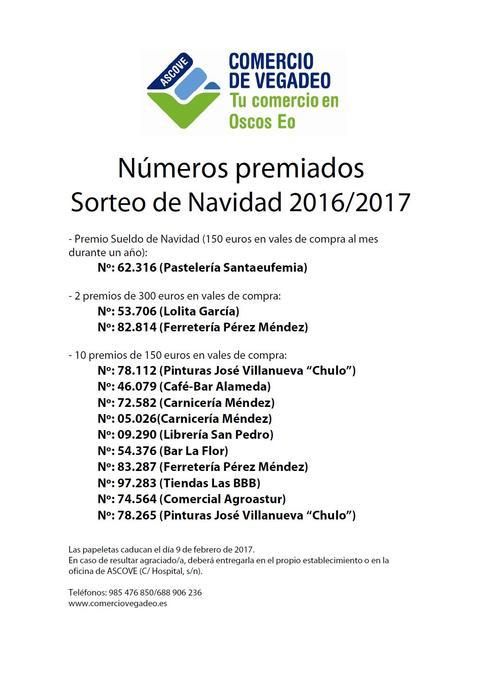 En el sorteo de la campaña de Navidad, celebrado ante notario, en el auditorio Félix Menéndez de la Casa de Cultura de Vegadeo el 10 de enero de 2017 a las 20:30h, los números premiados -con la relación de establecimientos a los que les ha correspondido entregarlos-, son los siguientes.