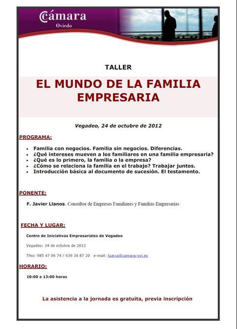 La Cámara de Comercio de Oviedo organiza para el próximo miércoles 24 de octubre un taller que lleva por título "EL MUNDO DE LA FAMILIA EMPRESARIA". En él se abordarán aspectos tan importantes como la situación y configuración de las empresas familares, predominantes en nuestra estructura comercial, o un acercamiento al documento de sucesión.